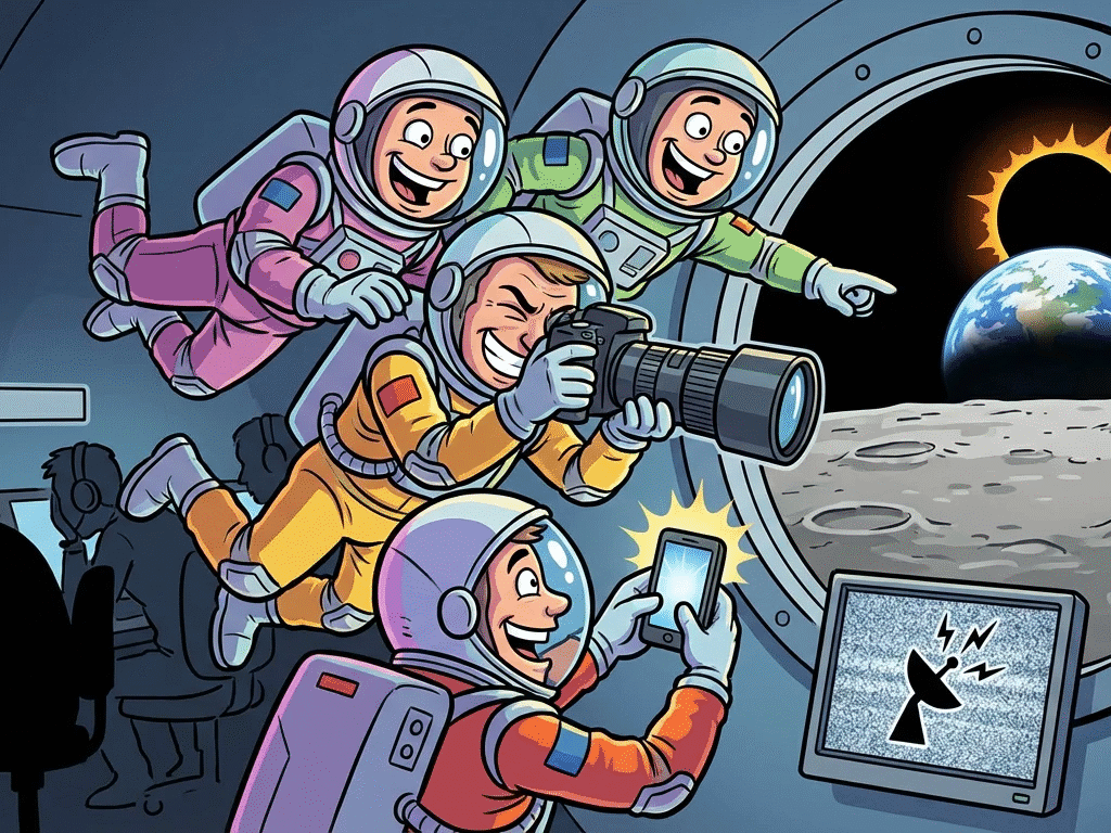 E não foi “passou e tchau”: durante cerca de sete horas, a tripulação fotografou crateras, planícies e formações, descrevendo a paisagem para cientistas na Terra. Teve até um eclipse solar visto da órbita lunar — o disco da Lua cobrindo completamente o Sol e deixando a coroa solar brilhando ao redor. O tipo de imagem que, na Terra, já é raro; dali, então, é quase “acesso VIP ao universo”.