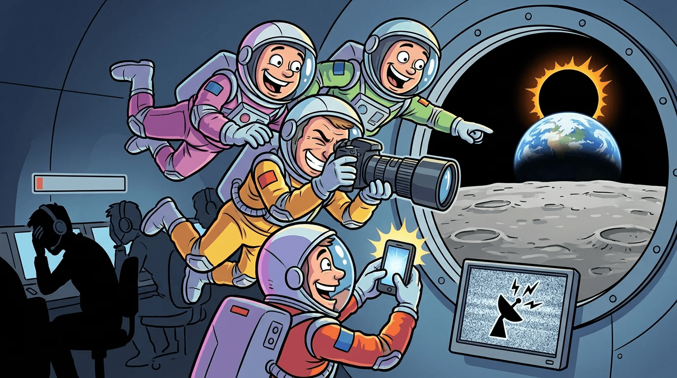 Ah, e o “apagão”: ao passar pelo lado oculto, a missão enfrentou cerca de 40 minutos sem comunicação, porque o satélite bloqueia o rádio. Aconteceu nas Apollo, aconteceu na Artemis I e, claro, voltou a acontecer agora — o espaço mantendo suas tradições.